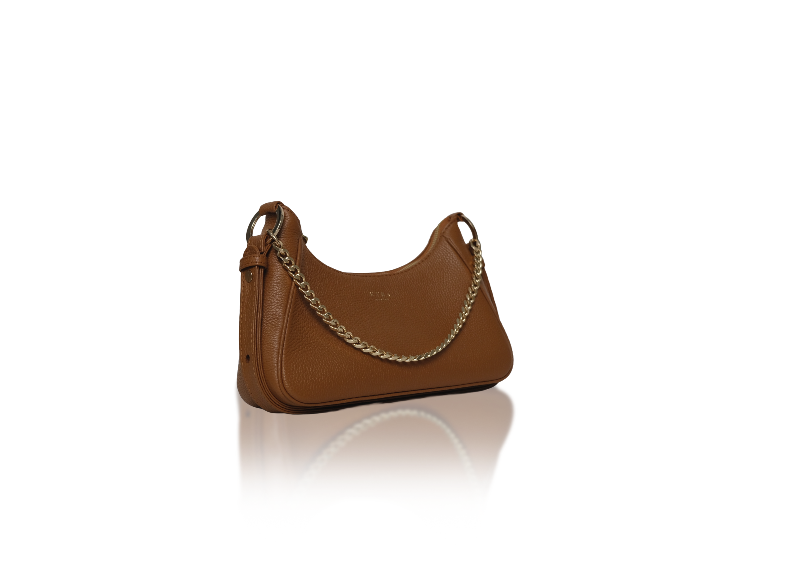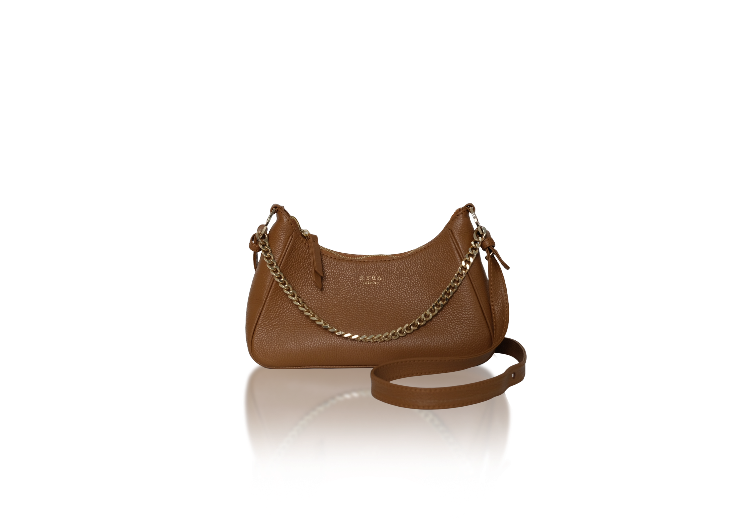 KYRA’s IVY bag has rectangular trapezoid shape, with a curvy top zipper closure. Connected with signature unique Ring, giving IVY an options for a chain strap for a handbag, or unfold the leather strap, to use it as a shoulder bag. Adjust the strap to the length you desire to make it as a cross-body-bag.