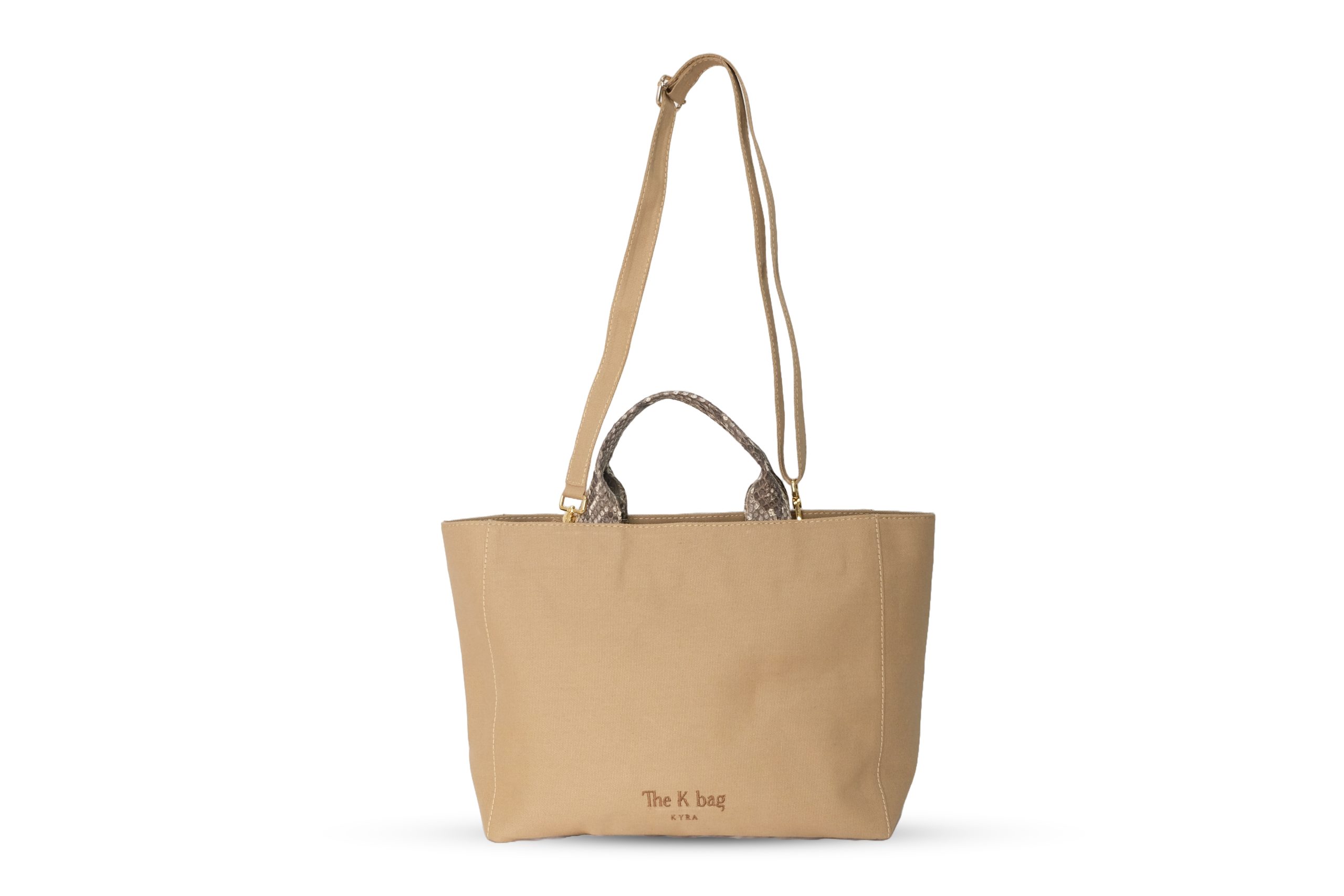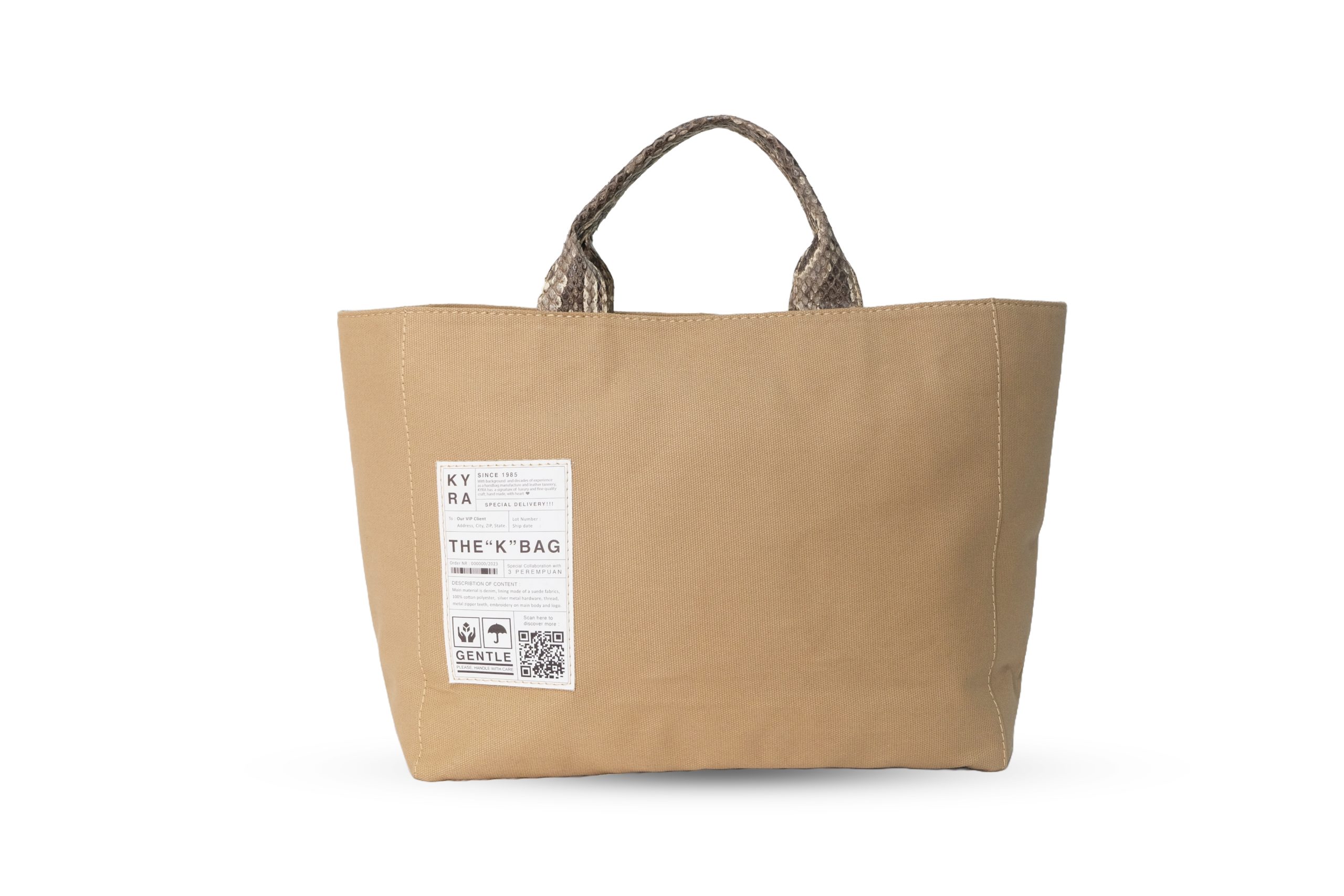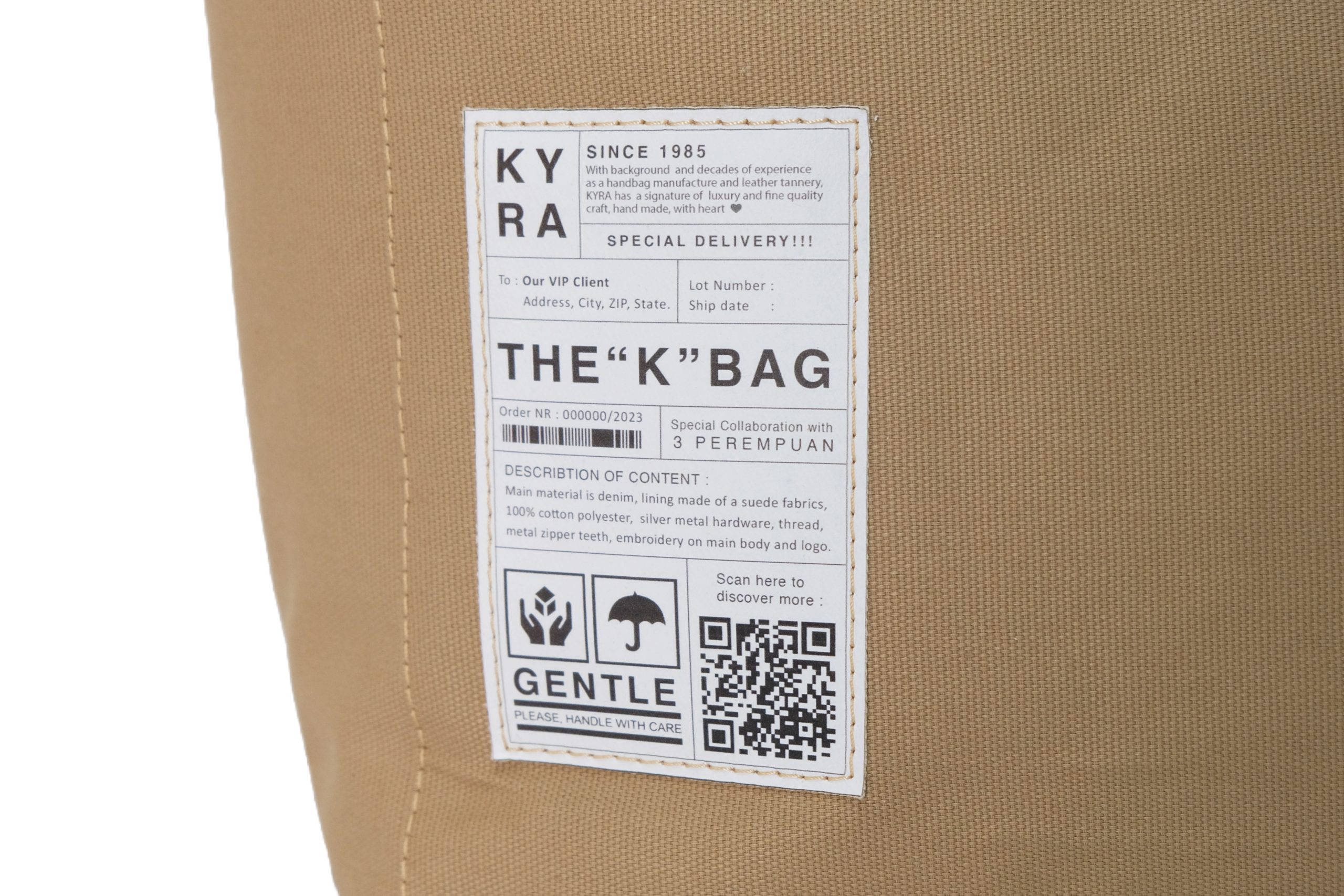 KYRA bersama dengan 3 Perempuan, menciptakan karya kolaborasi bersama yang kami sebut dengan K-bag, dengan K yang merupakan singkatan dari KYRA untuk memberikan kesan casual, muda, dan stylish. Koleksi K-Bag merupakan koleksi tas harian yang ditujukan untuk para wanita modern yang membutuhkan banyak ruang untuk menopang bawaan hariannya. Terbuat dari kombinasi kanvas berkualitas tinggi, menjadikan K-bag terasa begitu ringan namun tetap kokoh dipakai untuk sehari-hari, dipadukan dengan aksen utama berbahan kulit exotis yang mewah khas dari KYRA. Dibagian belakang terdapat design label disengaja, berisi informasi mengenai produk, yang juga merupakan nilai estetika.