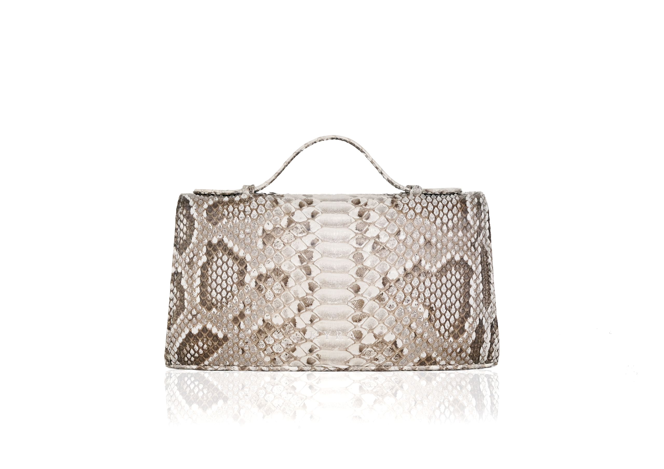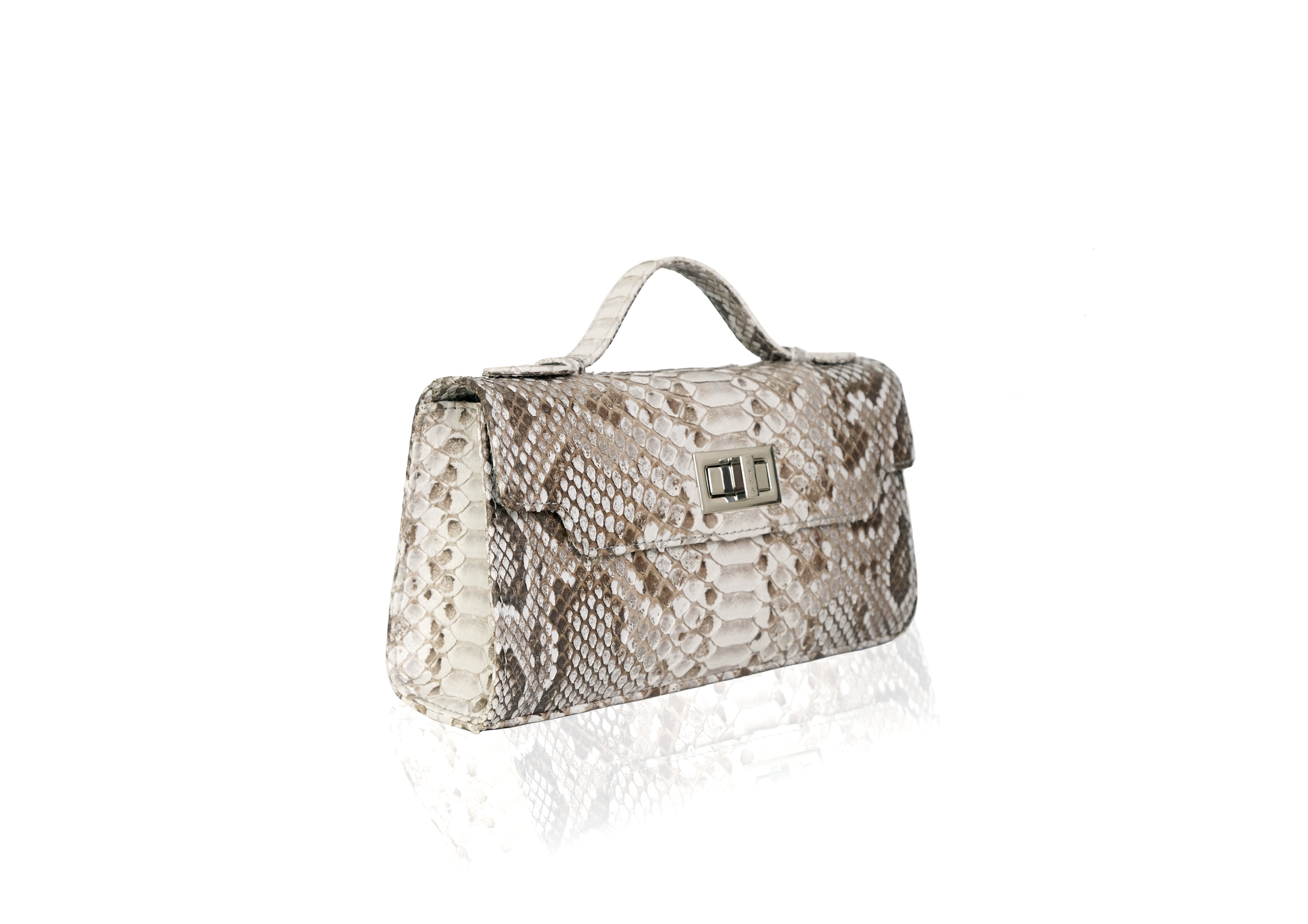 A structured handbag in natural python leather — earthy, exotic, and naturally sophisticated. Worn as a refined top-handle bag, a clutch with the handle folded down, or a shoulder bag with the detachable strap for daily versatility. Three interior compartments and a magnetic closure keep your essentials in place.
