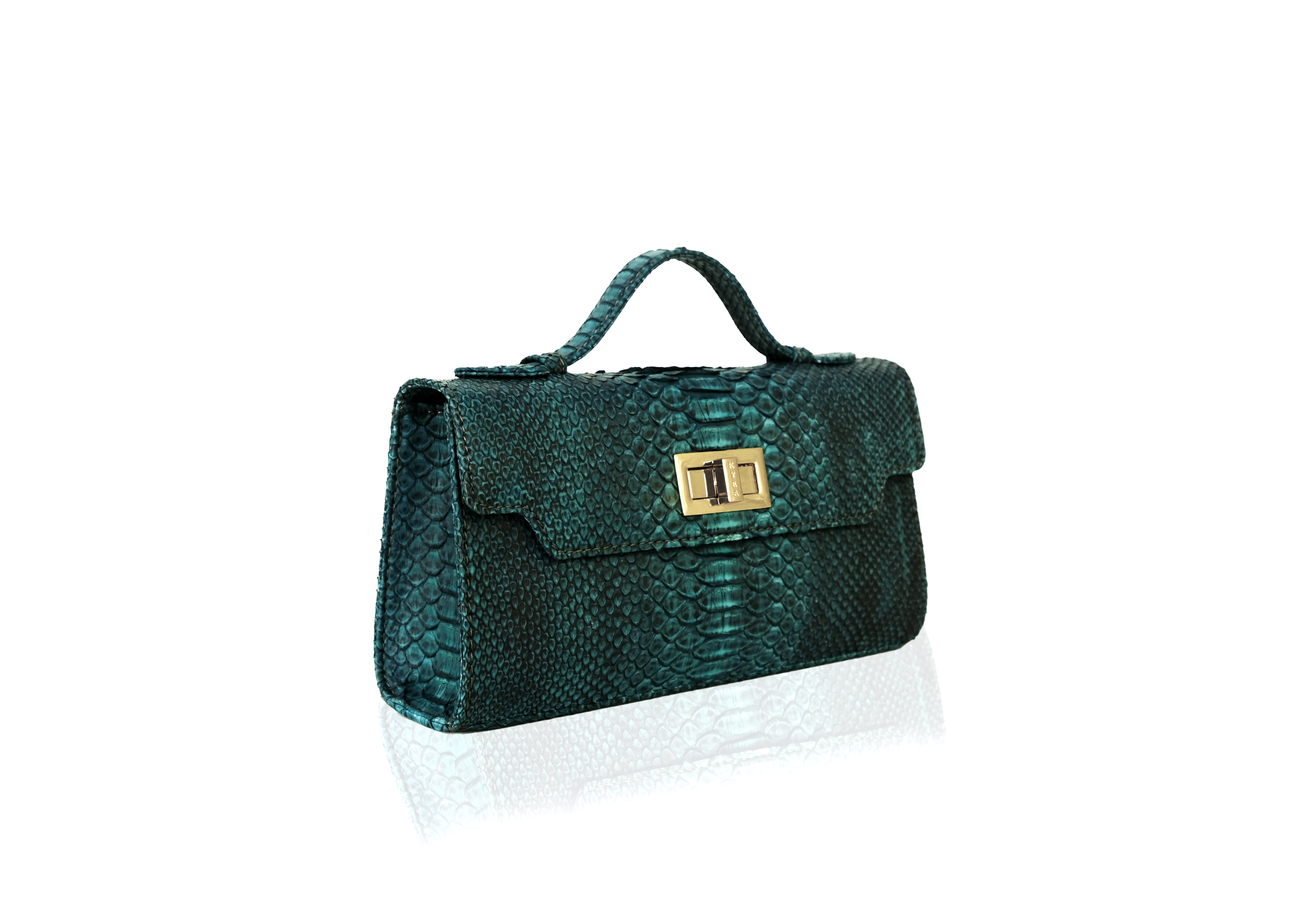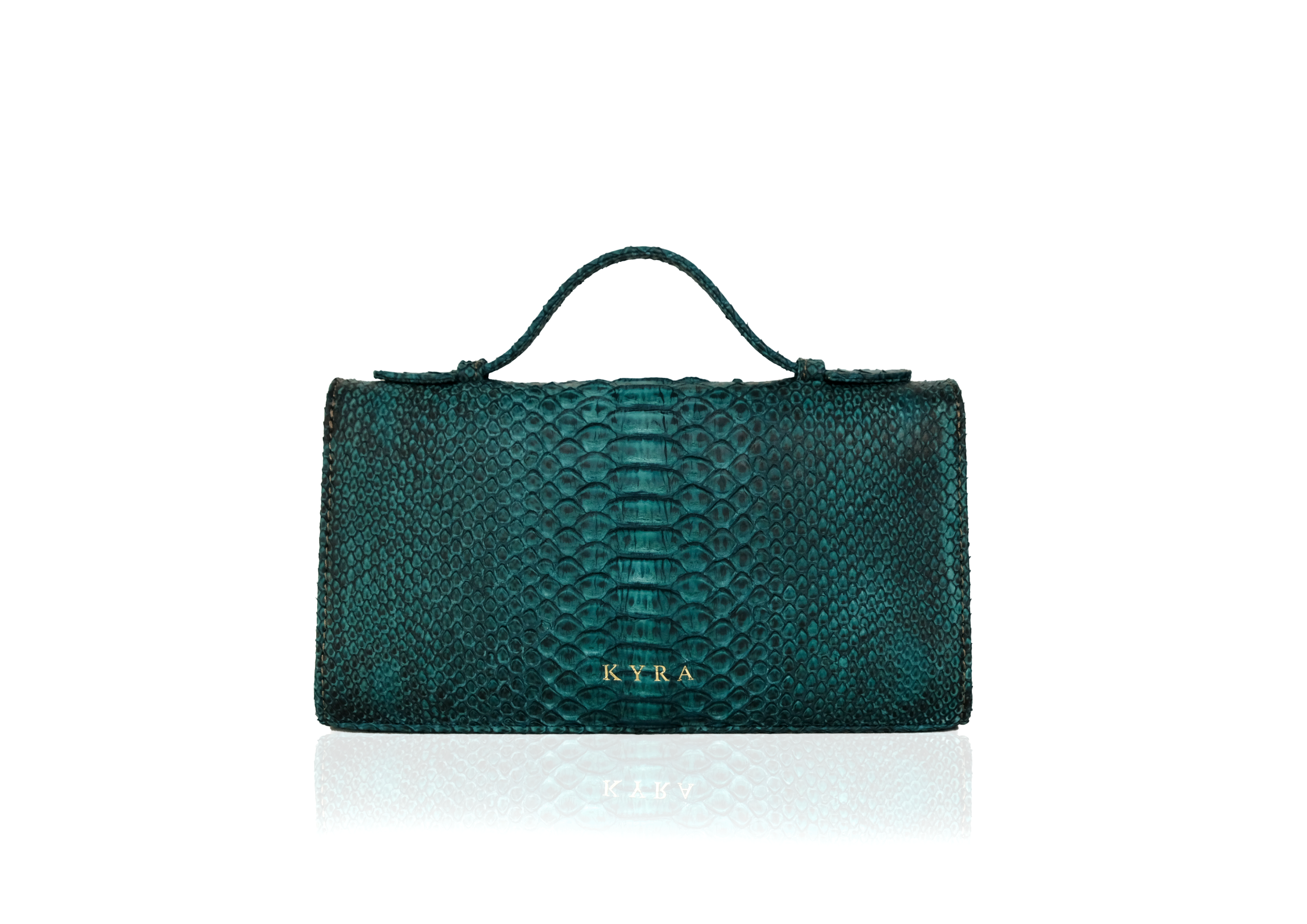 A structured handbag in genuine python leather, presented in rich peacock blue — bold yet refined. Worn as a sleek top-handle bag, an elegant clutch with the handle folded down, or a shoulder bag with the detachable strap for hands-free ease. Three interior compartments and a magnetic closure keep your essentials in place.